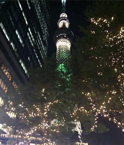 クリスマスツリーに見立てたクリスマス限定ライティングのスカイツリーでしたが、